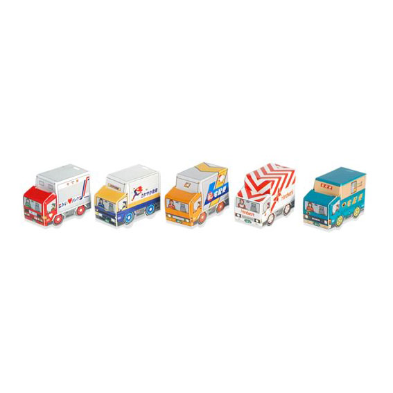 5種類の配送の車をパロディで表現。中にはミンツ(酸っぱいイチゴ味)菓子が入っています。