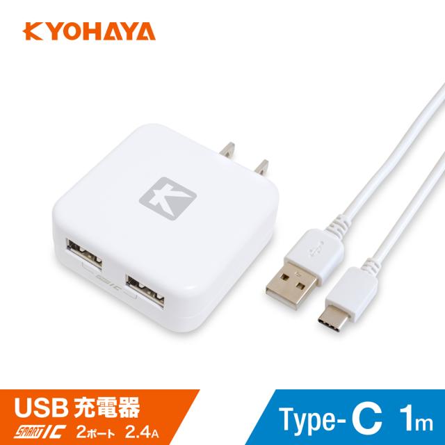| 商品名 | KYOHAYA USB2ポート 2台同時急速充電器 2.4A ACアダプター USB Type-Cケーブル 1m 1本付きセット |