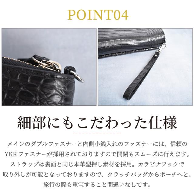 | 特徴 | 『ワニと本革型押し、異素材が融合したお財布バッグ』 洗練されたクロコダイルの背中から尾の部分を使用しています。 表面にゴツゴツとした隆起があり力強い印象と、程よいツヤ感は何とも言えない高級感を与えてくれます。 正面ポケットはワニ本革を、その他部分には本革型押しで仕立てた上品な逸品です。 『現金やカード、小物はもちろんスマホも一つに収納できる機能性。』 メイン収納には便利なダブルファスナーを採用して財布やスマホ、 手帳などのかさばりやすい物も小分けに収納ができる機能性を兼ね備えた大人の上品バッグです。 『クロコダイルホーンレザー』 クロコダイルの背中から尻尾にかけての貴重なレザーを使用。 圧倒的な存在感は美しく、ラグジュアリーな雰囲気があります。 また、『皮革の宝石』と称されるその革は使い込むほど、風合い豊かになっていきます。 当店にはクロコダイルと関わって約70年の歴史があります。 スペシャリストが厳選したクロコダイルをお手に取り、ご堪能下さい。 『財布も兼ねる万能ミニバッグ』 スマホの進化により財布がコンパクト化する一方、 現金と必要な物がオールインできると便利で人気なオーガナイザータイプです。 財布とポーチの機能を持ち合わせた2層構造で、 小物を整理して収納できる機能性が最大の特徴のバッグになります。 『便利な2層式のポケット』 本革素材で掴みやすい持ち手のダブルファスナー仕様です。 正面側はたっぷり使える財布としての機能を、背面側のメイン収納ポケットには スマホや通帳、パスポートなども十分収まるので旅行などの外出時だけでなく、 普段使いにもおすすめのアイテムです。 『使いやすい外側ポケット』 表側のワニ革ポケットの中心にはマグネットが付いており、 波打ったポケットの形状から、内容物が外から見えにくくなる目隠しにもなっております。 背面の型押しポケットには、レシートなどを小分けに収納する場所としてもお使い頂けます。 『細部にもこだわった仕様』 メインのダブルファスナーと内側小銭入れのファスナーには、 信頼のYKKファスナーが採用されておりますので開閉もスムーズに行えます。 ストラップは裏面と同じ本革型押し素材を採用。 カラビナフックで取り外しが可能となっておりますので、 クラッチバッグからポーチへと、旅行の際も重宝すること間違いなしです。 |