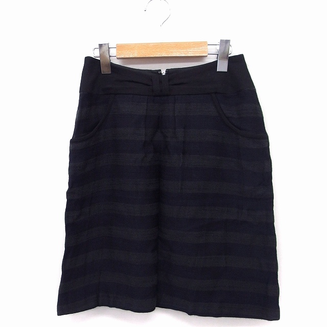 【中古】ルクールブラン le.coeur blanc ボーダー フレアスカート ひざ丈 ウエストリボン 38 グレー 灰 ブラック 黒