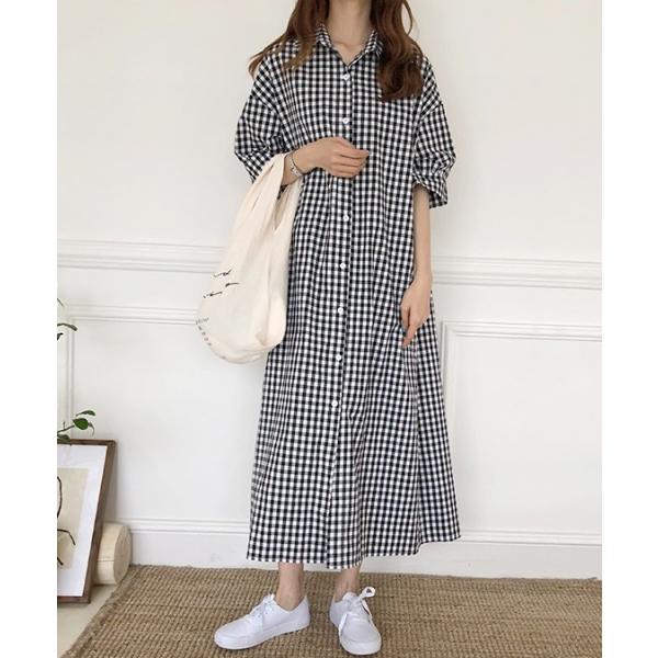 ワンピース ロング 五分袖 春 夏 ギンガムチェック シャツワンピース 通学 学生 お出かけ 前開き カジュアル 部屋着 人気商品 送料無料