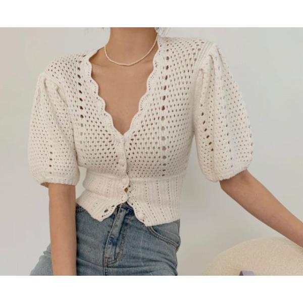 トップス レディース ニット カーディガン ショート丈 パフスリーブ Vネック カーデ 韓国ファッション 春 夏 かわいい 大人可愛い レトロ