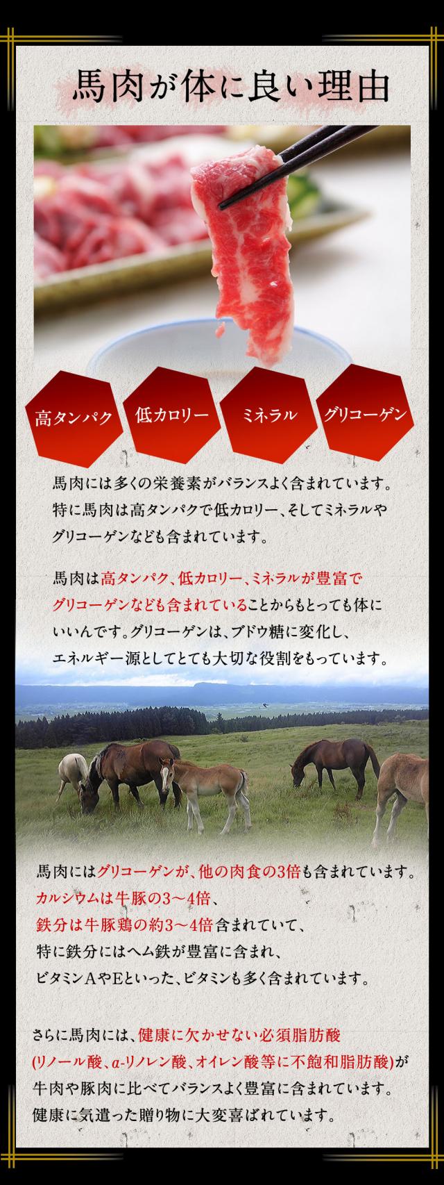 | お召し上がり方 | 王道のにんにく、生姜のすりおろし醤油が美味しいですが、粗挽きの塩や柚子胡椒も馬肉本来の味が味わえるので、おすすめです! |