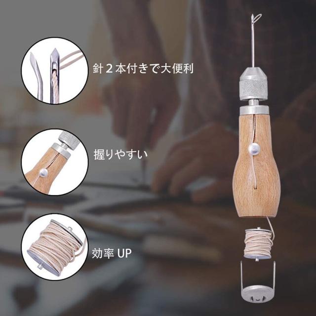 【セット内容】手縫機本体 針2本入り(ストレート針と湾曲針) ロウ引き系1点(ブラック)ストレート針と湾曲針を使用すると、さまざまなレザークラフトを作ることができます。【使用範囲】テント、リュックサック、寝袋、室内装飾品の修理に最適です。手によく馴染む木製グリップで力を入れやすく、針も太くて貫通力があり、簡単に厚い生地を縫うことができます。