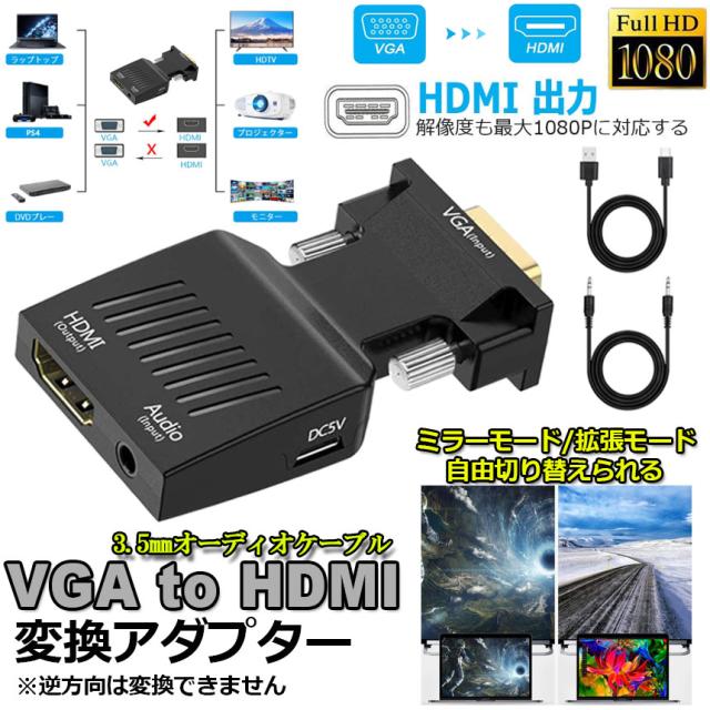 VGA to HDMI 変換 アダプター VGA to HDMI Adapter VGA to HDMIコンバーター オーディオ付き 1080p ビデオ出力 音声出力 VGA-HDMI(オス-メス)コンバータードングルアダプター モニター コンピューター ラップトップ プロジェクター対応 Windows XP/7/8/10など対応