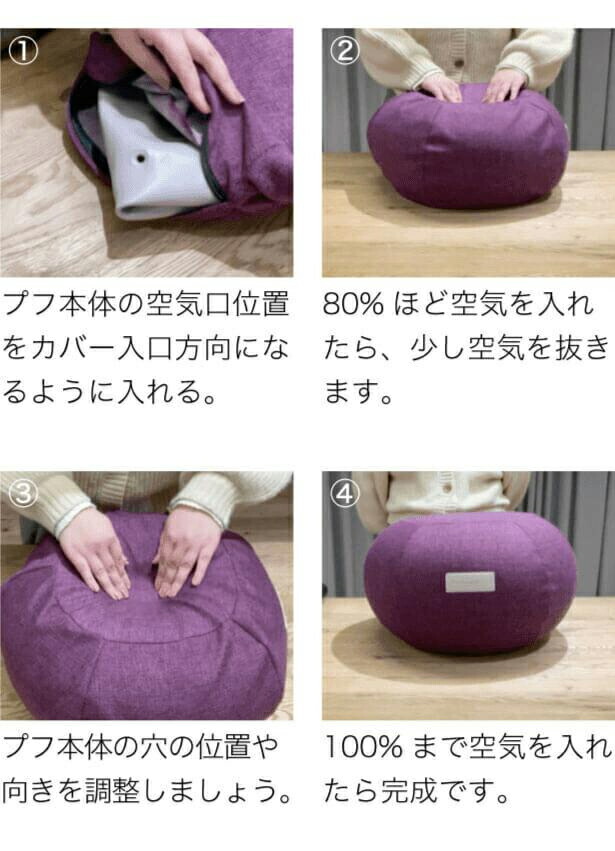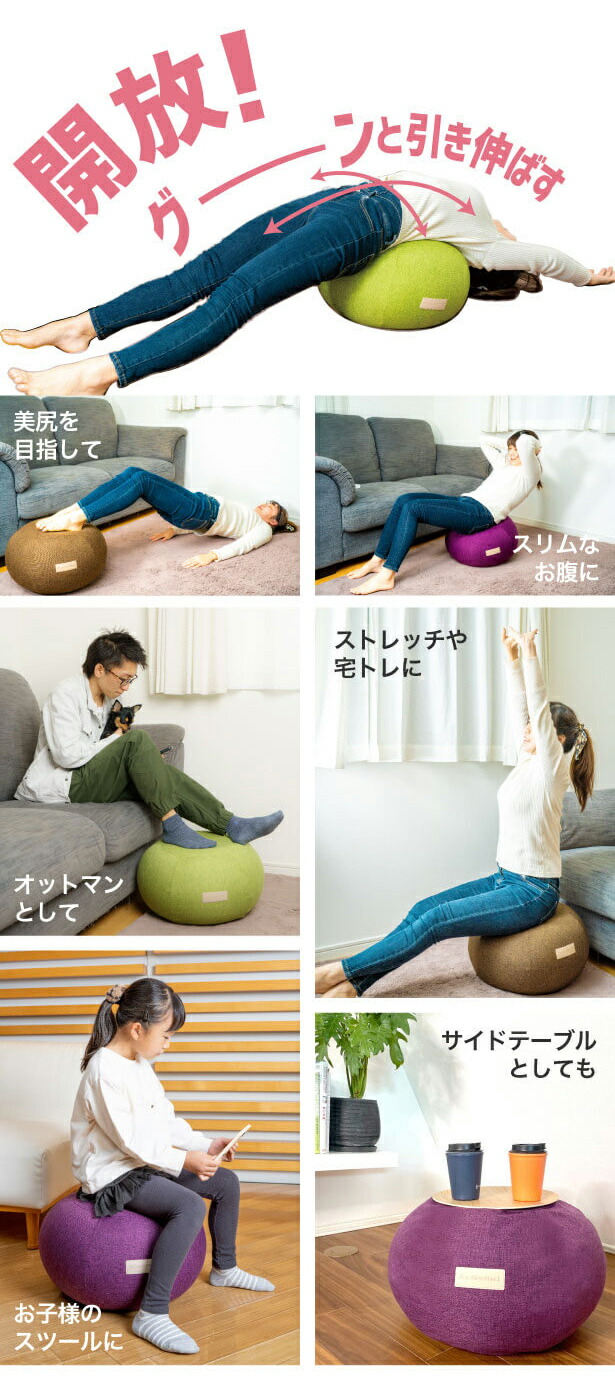 - バランスボールだけど、安定していて椅子としても使えるのでリビングで重宝しています。空気は1日置いて、翌日入れたら綺麗な型にたりました。パープルは落ち着いた色で気に入ってます。