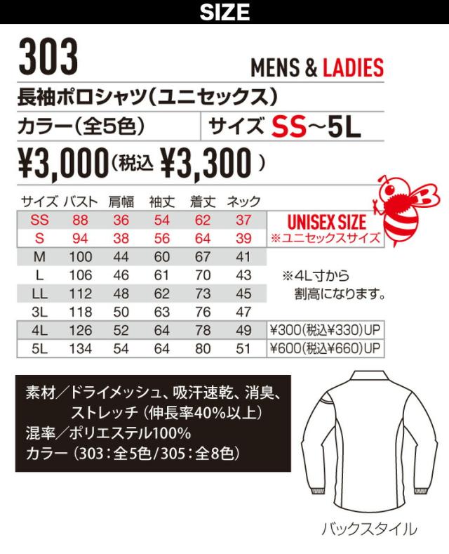 バートル 長袖ポロシャツ 吸汗速乾 ドライメッシュ 303 BURTLE 作業服 作業着 スタッフ ユニフォーム 定番 レディース メンズ