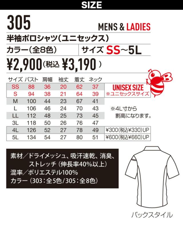 バートル 半袖ポロシャツ 吸汗速乾 ドライメッシュ 305 BURTLE 作業服 作業着 スタッフ ユニフォーム 定番 レディース メンズ