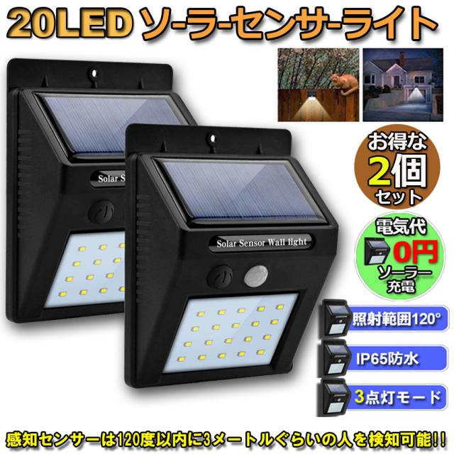 20LED センサーライト 2個セット 屋外 ソーラーライト 3つ知能モード 高輝度 防犯 人感 防水 屋外照明 120°照明範囲 防犯ライト 夜間自動点灯 太陽光発電 庭 玄関 駐車場 通路 ガーデンライト 大活躍