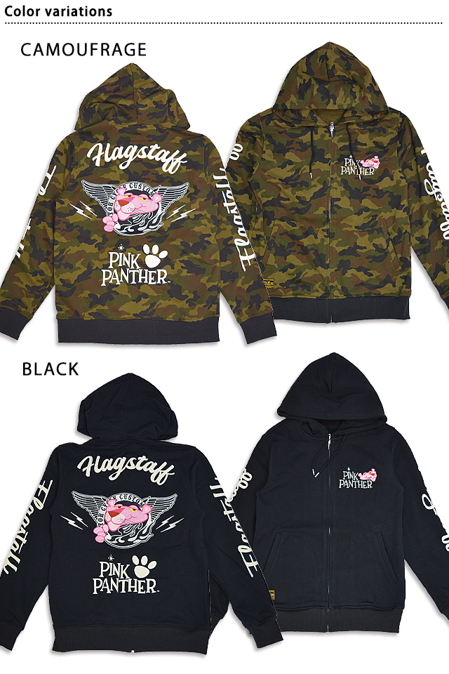 斬新なアイディアとインパクトのあるデザインが魅力的な、絡繰魂の姉妹ブランド【Flagstaff】より「ピンクパンサー×フラッグスタッフ 裏毛スウェットパーカー(424004)」のご紹介です。 アメリカの人気アニメーションのキャラクター「ピンクパンサー」とのコラボが実現しました! ピンクパンサーはその名の通り、ピンクの豹。 今回は裏毛スウェットをボディーに採用し、着まわしのきく逸品を完成させました。 フロントはジップアップ仕様。 アメカジ×ピンクパンサーが絶妙に組み合わせられた、Flagstaff拘りの逸品です。 | ||||||||||||||||||||||||||