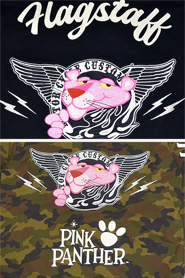 斬新なアイディアとインパクトのあるデザインが魅力的な、絡繰魂の姉妹ブランド【Flagstaff】より「ピンクパンサー×フラッグスタッフ 裏毛スウェットパーカー(424004)」のご紹介です。