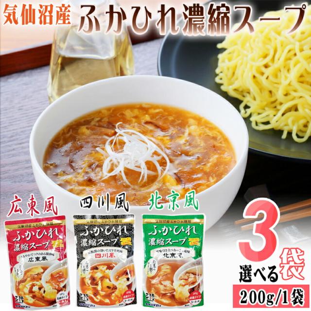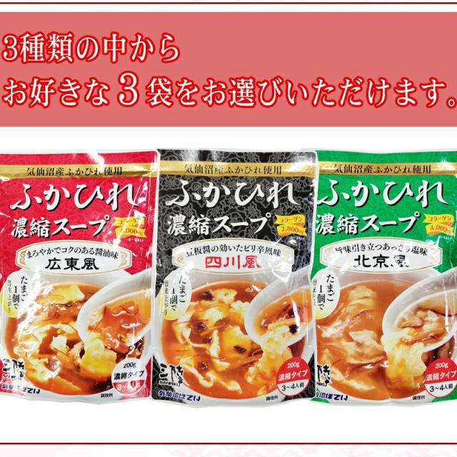 ふかひれ 濃縮 スープ 3種から3袋選べる 広東風 四川風 北京風 200g×3袋 9~12人前 気仙沼産 豪華 お試し ポイント消化 送料無料 NP メール便 [ほてい選べるふかひれ濃縮スープ×3 BM] 即送