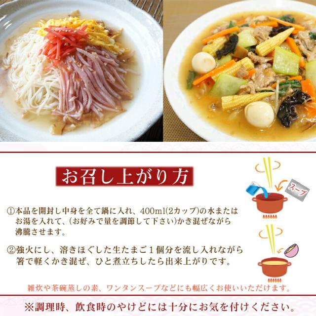 日本一のふかひれ水揚げ量の宮城県気仙沼産ふかひれを使用。鶏・豚ガラベースの醤油味で仕上げ、コクがありまろやかな風味の広東風。豆板醤や唐辛子ですっきりとした辛味と旨味に仕上げた四川風。鶏ガラや豚骨、魚介類、香味野菜の風味を効かせ、旨味が引き立つさっぱりとした塩味の北京風。どのお味も仕上げに溶き卵を1個加えるだけで、ご家庭でも本格的なふかひれスープをお楽しみいただけます。他にも、スープにちょっとひと手間加えてアレンジ次第で、様々な料理にもお使いいただけます。