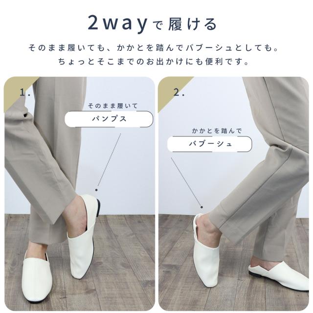 そのまま履くと「パンプス」に、かかとを踏むと「バブーシュ」になる2wayデザインです。