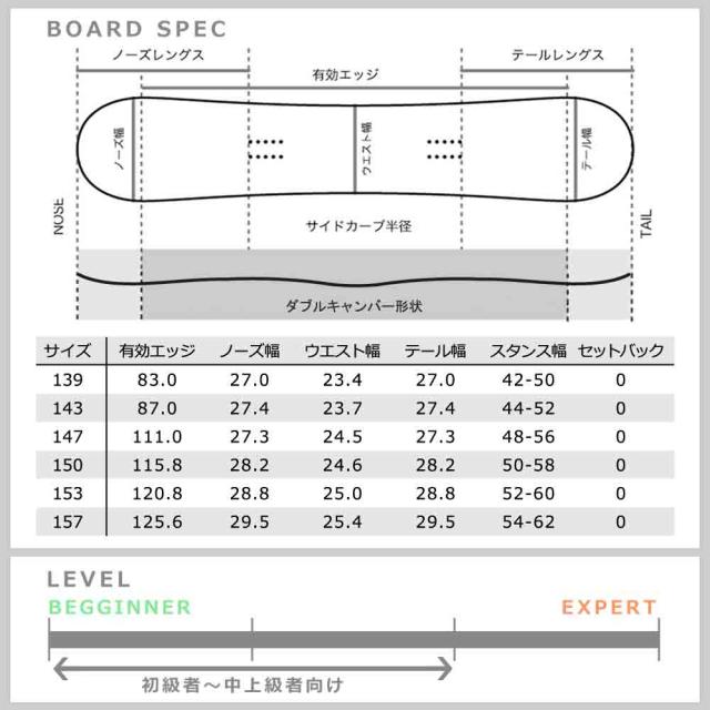 脚力に自身のない女の子でも乗りやすい!軽量&ソフトフレックスでかんたん楽々ターン♪ 足下付近がキャンバー、センターはロッカーになった2つの乗り味を楽しめるWキャンバー形状。 ロッカーの楽しさと、しっかり踏みこむことでキレのあるカービングもできるのでオールラウンドで楽しめる♪ 形状:ダブルキャンバー/ ガルウィング, ツインチップ, SW構造 |