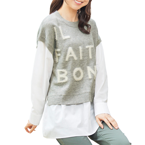 ジャカードニットとホワイトシャツをドッキングした、ロゴタイプが可愛い1枚で決まる重ね着風トップス。