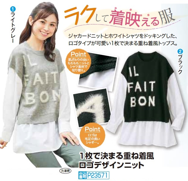 重ね着風 ニット レディース シニア 秋冬 1枚で決まる重ね着風ロゴデザインニット 全2色 トップス ニット一体型シャツ セーター シャツ ブラック グレー 婦人服 ミセス 女性 ファッション 50代 60代 70代 80代 母の日 お母さん ニット シンプル 英字 fri p23571