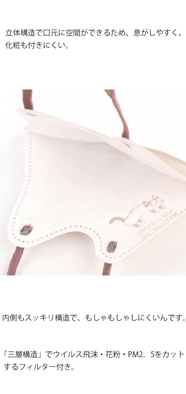 立体構造で口元に空間ができるため、息がしやすく、化粧も付きにくい。