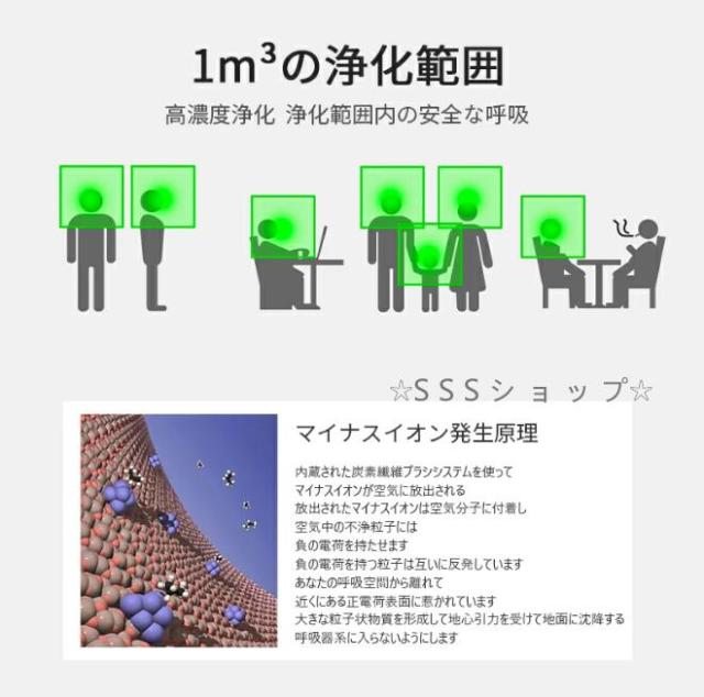 マイナスイオンが発生するため、森林浴をしているかのような爽やかな気分を味わうことができます。脱臭、ホルムアルデヒド除去、マイナスイオン空気浄化などの機能を持って、浴室、寝室、保管室、ガレージ、クローク、 ペットの巣などに適しています。ミニサイズなのでどこに置いても邪魔になりません。ホコリなどを除去し、春の悩みなくなった!マイナスイオン発生の技術で、森の中のような空気を送る、空気を清浄するだけではなく、空気もきれいにする!