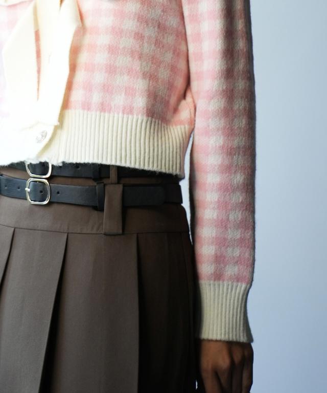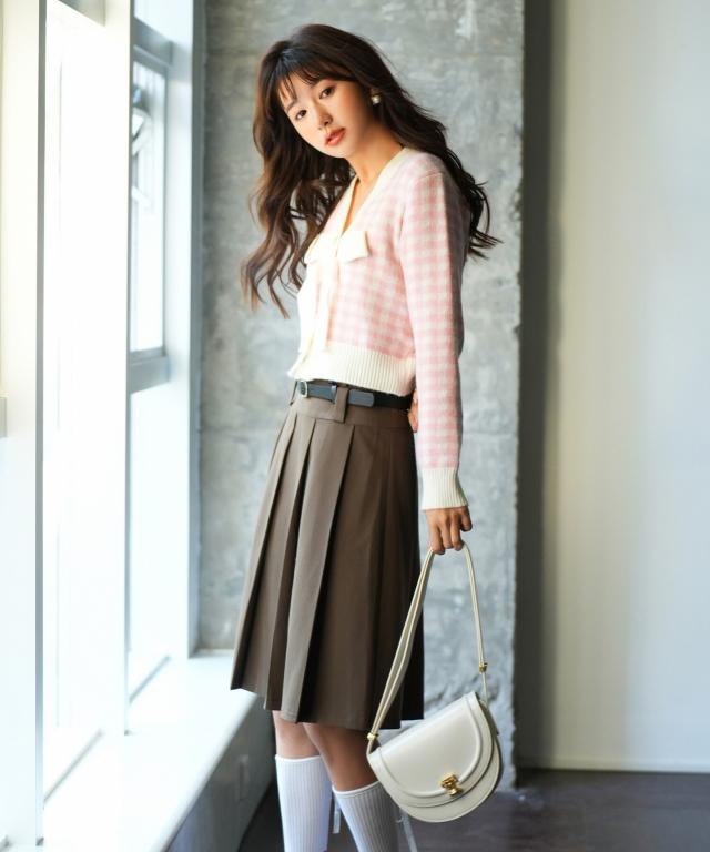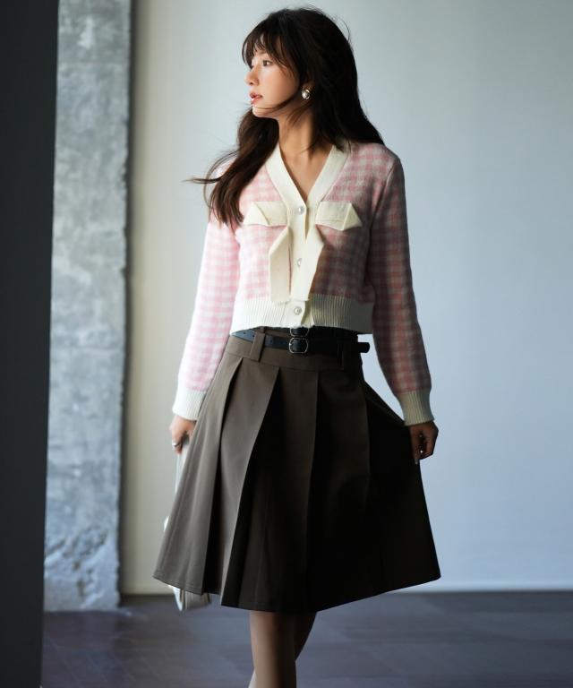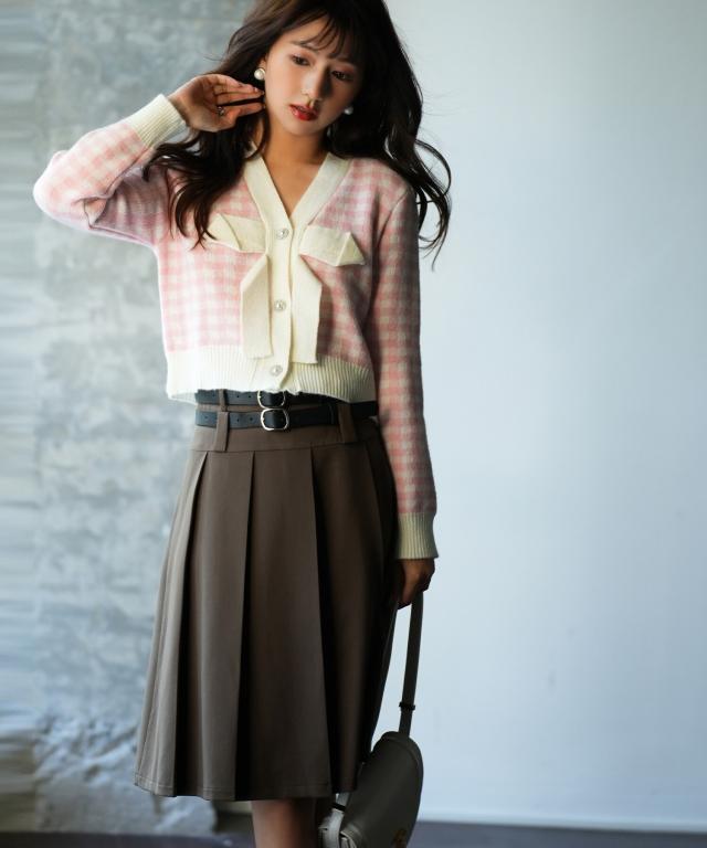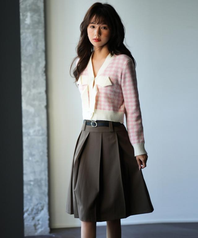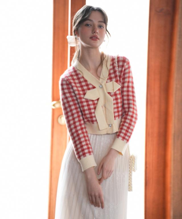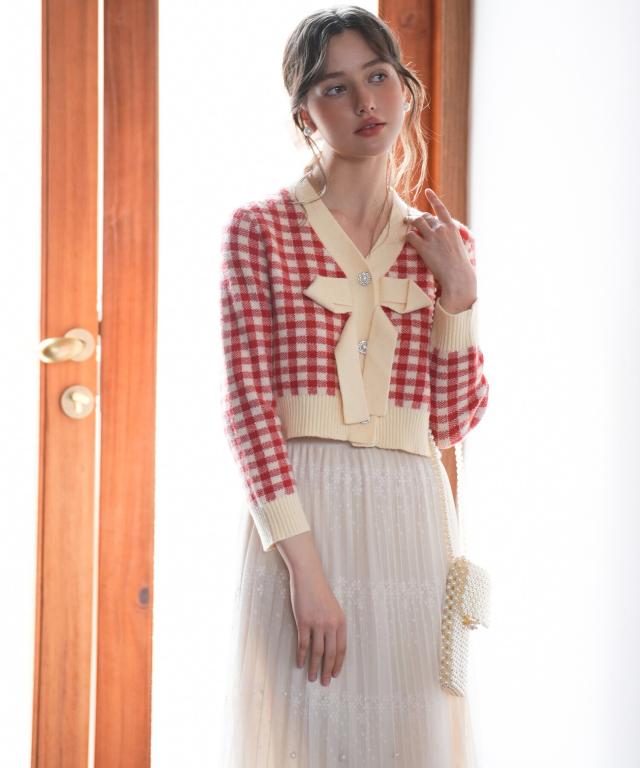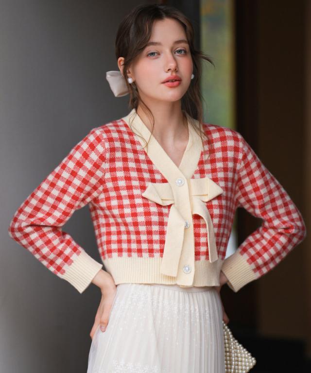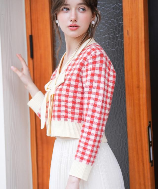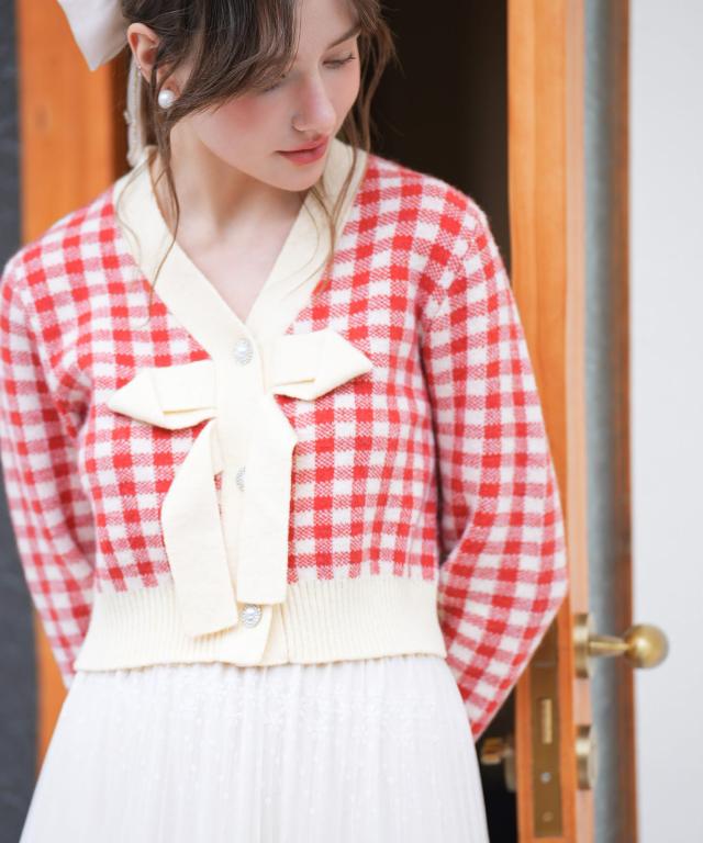 フェミニンなギンガムチェックで通勤服としても、休日のお出かけ服としてもデイリーに使える、フロントリボンニットプルオーバー。