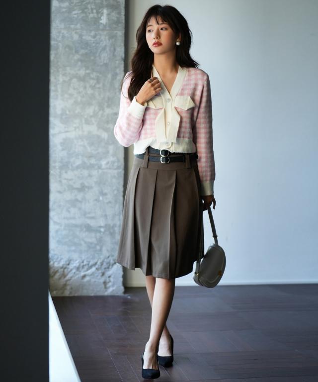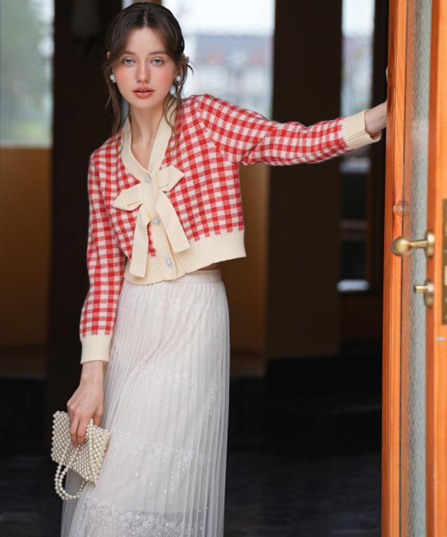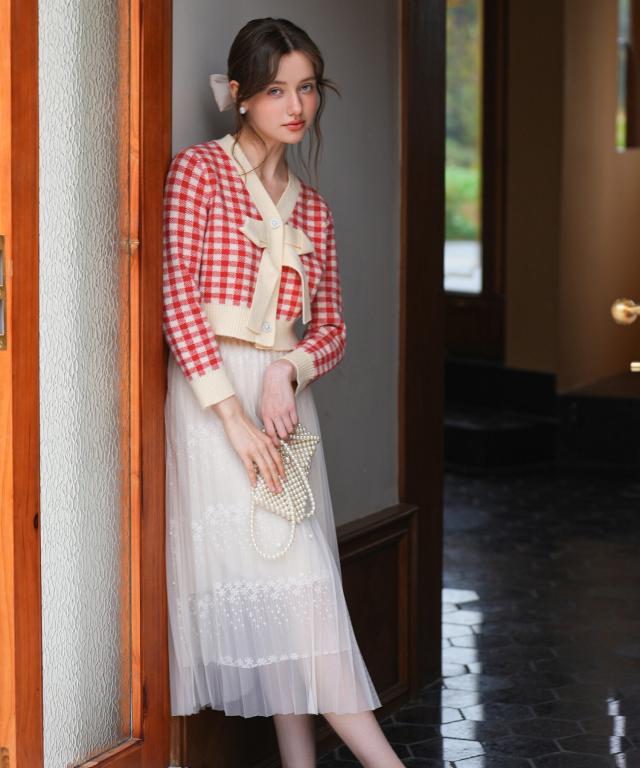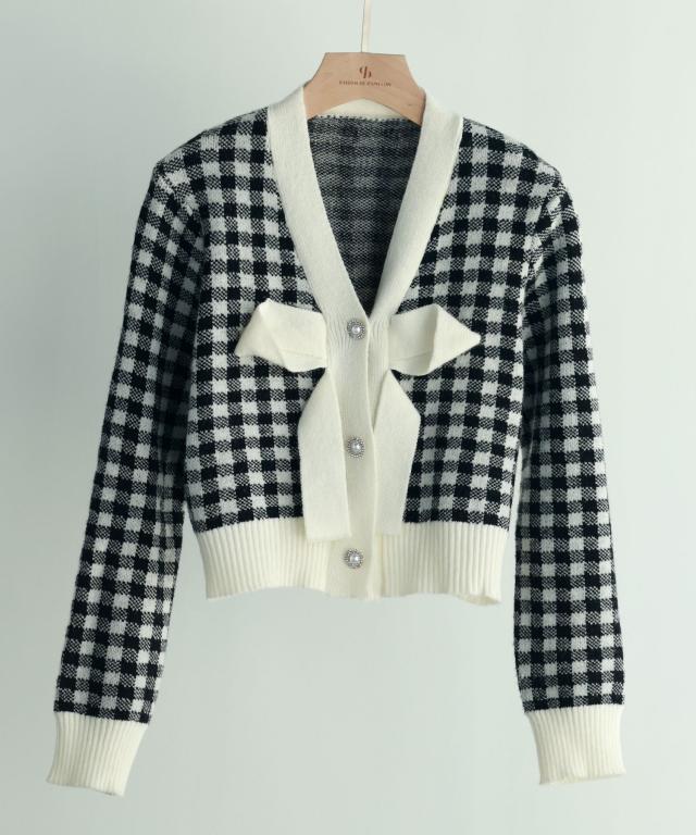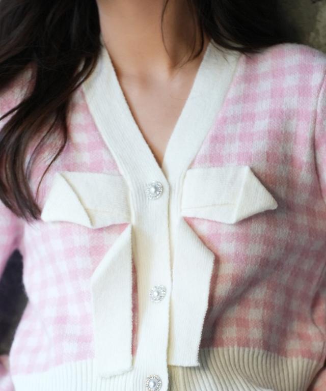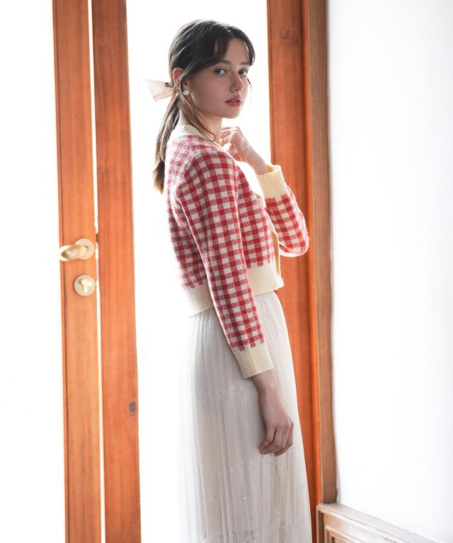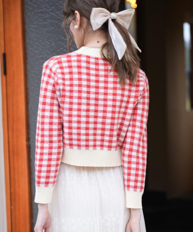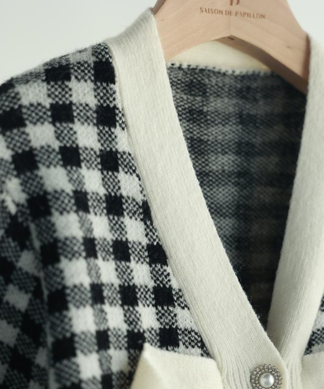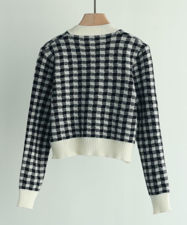 やや大柄なギンガムチェックの編地は甘すぎない大人フェミニンスタイルに最適,シンプルなコーディネートでもきまる1枚です。