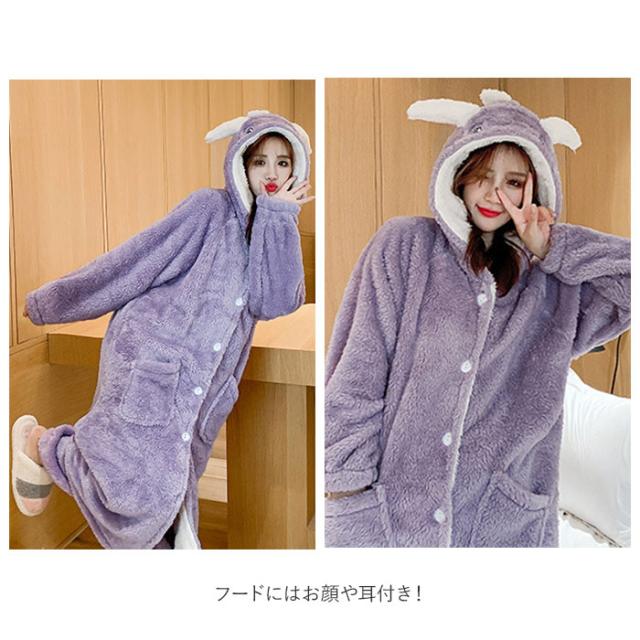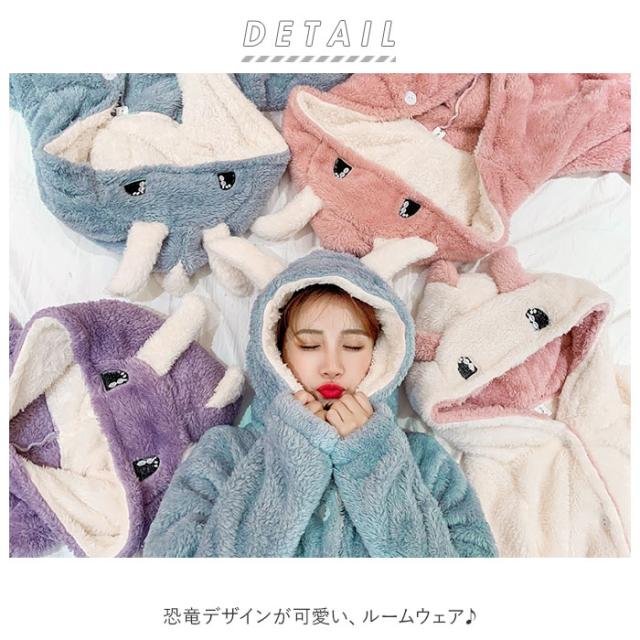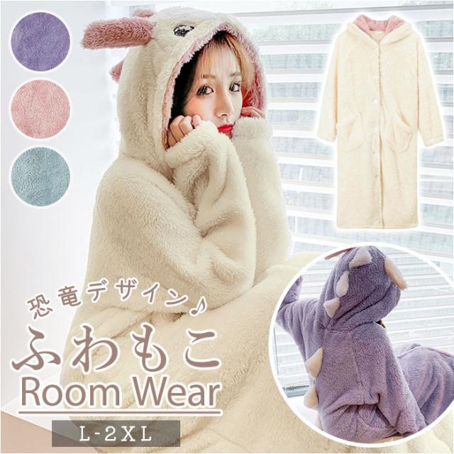 ルームウェア レディース 通販 もこもこ パジャマ ロング フード付 寝巻き バスローブ ワンピース ポケット あったか ゆったり 恐竜 かわいい 冬 秋 デザイン
