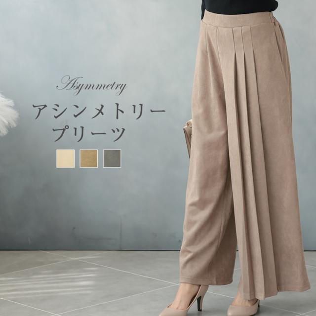 [30%OFFクーポンで3843円] ワイドパンツ レディース プリーツパンツ ストレートパンツ きれいめ オフィス カジュアル 秋 冬 アシンメトリー スエード パンツ ボトムス ズボン ウエストゴム ロング丈 プリーツ ゆったり ハイウエスト 無地 白 黒 ベージュ ブラウン 美脚 ボトム