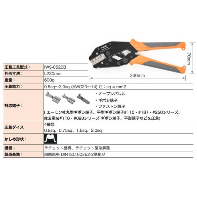 IWISS ラチェット式 ギボシ端子 精密同時圧着ペンチ MultiCrimper圧着シリーズ 0.5-2.0mm2対応 IWS-0520B