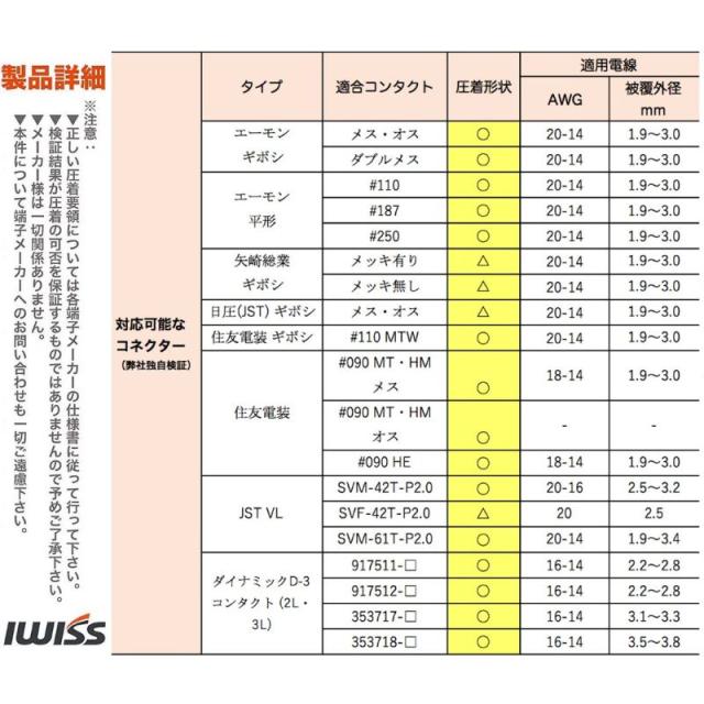対応端子: JSTギボシ端子、矢崎ギボシ端子、エーモン平型ギボシ端子#250・#187、ダイナミックコネクタD-3000シリーズD-3コンタクト3Lに対応。