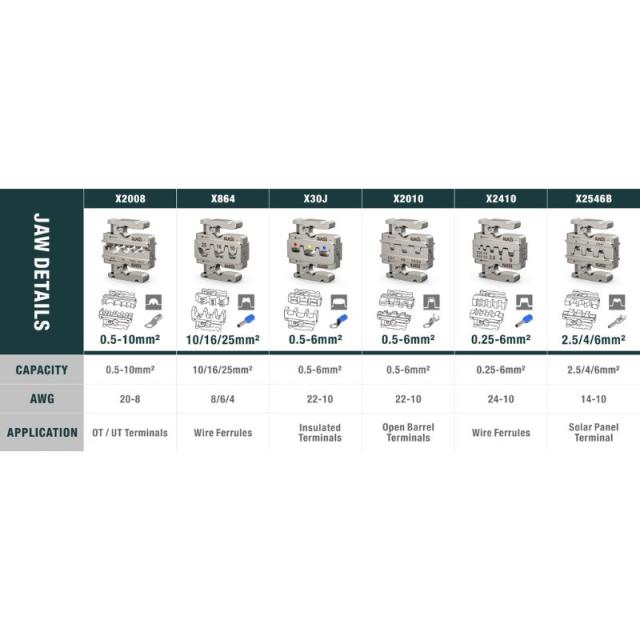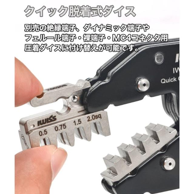 ・別売の絶縁端子、ダイナミック端子やフェルール端子・裸端子・MC4コネクタ用圧着ダイスに付け替えが可能です。