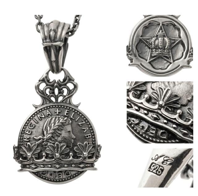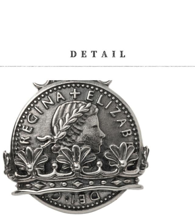 | 仕様 | イギリスのヴィンテージコインモチーフ。身につけると豊かで幸せな人生をもたらすと言い伝えられているシックスペンスコイン。アルテミスキングスらしくクラウンもコイン上にデザインされた上品な仕上がり。エリザベス2世レリーフも美しく、本体上部の唐草も繊細で美麗。アルテミスクラシックとのWネームアイテム。裏には星に王冠とブランドと925の品質刻印。 |