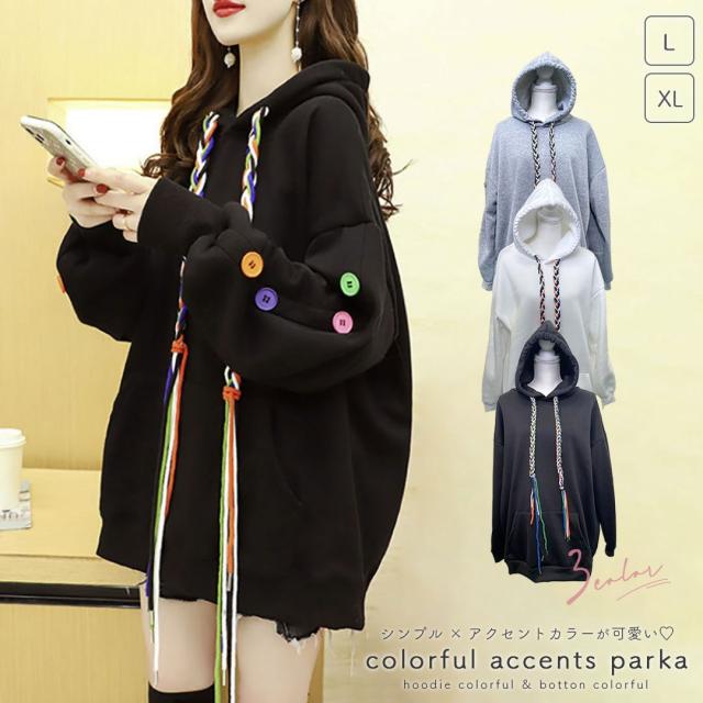 【在庫限り】 パーカー ボタン カラフル フード紐カラフル ブラックorホワイトorグレー トップス プルオーバー 韓国ファッション ビッグプルオーバー メンズ レディース カットソー スウェット スエット トレーナー 長袖 長そで 十分袖 十分そで