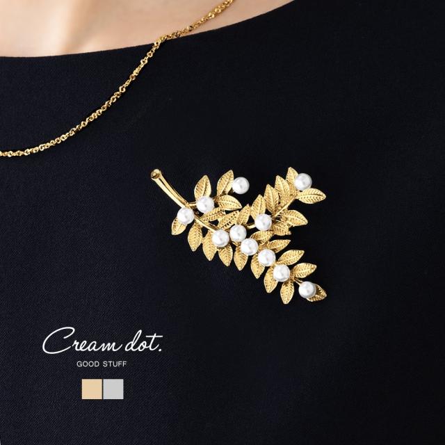 メタルリーフ×パールが上品に艶めくブローチ。シンプルで程よい存在感と、繊細なデザインがコーデを品よくブラッシュアップしてくれます。お祝いシーンなど華やかな場での装いにオススメの一品です◎
