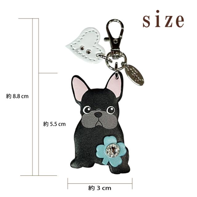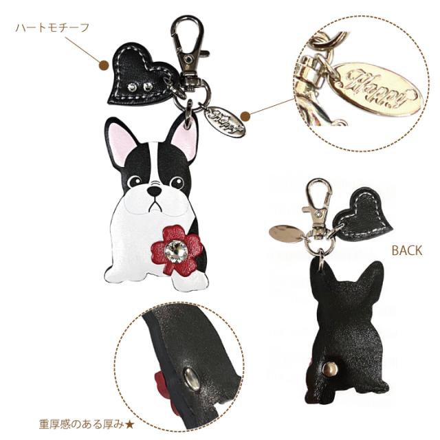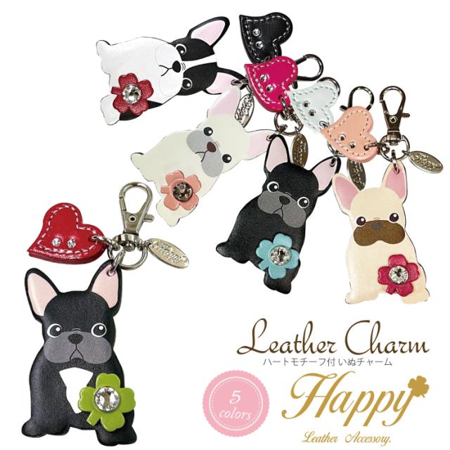 【メール便対応】Happyチャーム -40 フレンチブルドック 本革 牛革 ドッグ 犬 ハート フレブル ブルドッグ レザー スワロフスキー付 シンプル プレゼント ギフト キーリング キーホルダー バックチャーム チャーム 日本製 贈り物 ハッピー バッグ 可愛い 上品┃