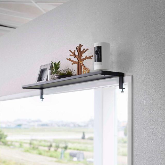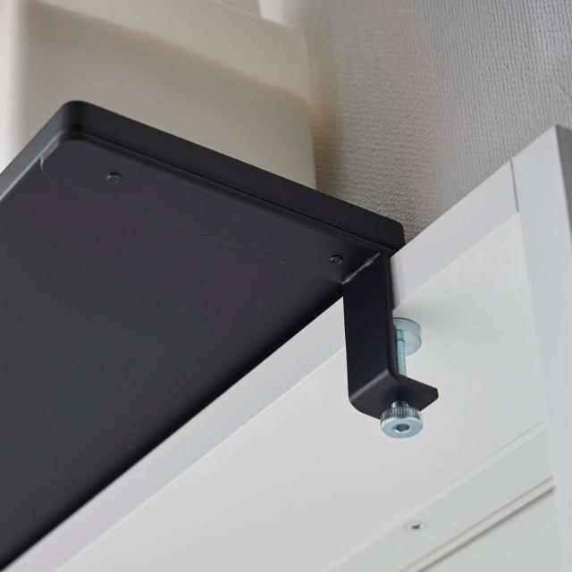 木製の鴨居、スライド扉の枠、窓枠に設置できる幅65cmのワイドラックです。挟んでネジで固定するだけなので簡単に取り付けできます。リビングで写真を飾ったり、防犯カメラなどを置くスペースとしても便利です。モダンな雰囲気のお部屋にも馴染みやすいシンプルなデザインです。