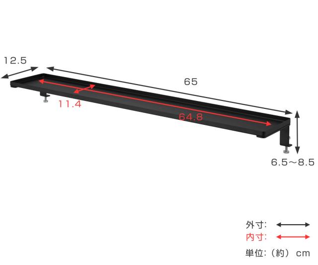 | サイズ | 外寸:約 幅65×奥行12.5×高さ6.5〜8.5(cm) 内寸:棚板 約 幅64.8×奥行11.4(縁:約高さ0.9cm) |