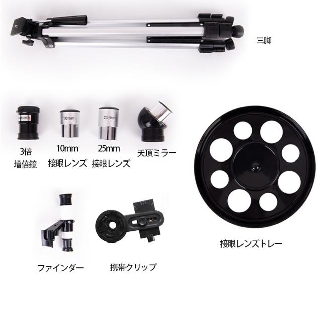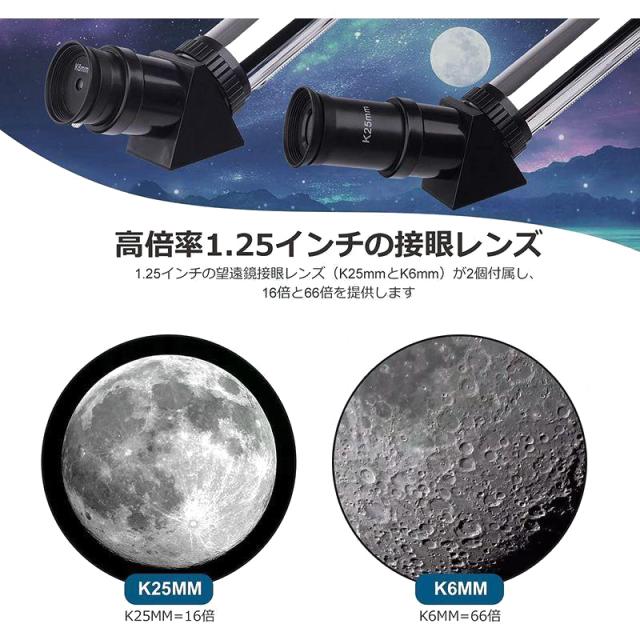 ・1.25インチの望遠鏡接眼レンズ(K25mmとK10mm)が2個付属し、16倍と40倍を提供します。 付属の3倍増倍鏡を弁用したら、最大倍率は120倍になります。