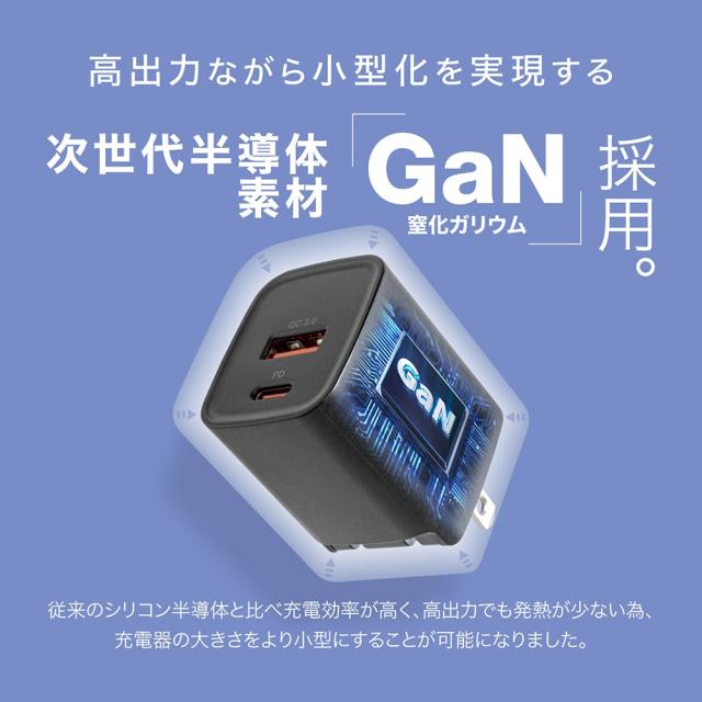 | 従来のシリコン半導体と比べ充電効率が高く高出力でも発熱が少ない、次世代半導体素材「GaN(窒化ガリウム)」を採用することで、 充電器の大きさをより小型にすることが可能になり、極小サイズを実現したコンパクト設計のUSB充電器です。 |