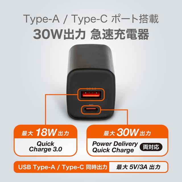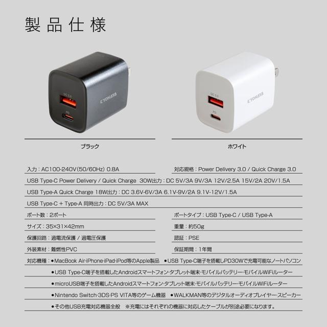 USB充電器 タイプC 急速 PD対応 QC対応 30W 急速充電 ACアダプタ USB-A USB-C 2ポート GaN 窒化ガリウム採用 極小タイプ JKPD30M2