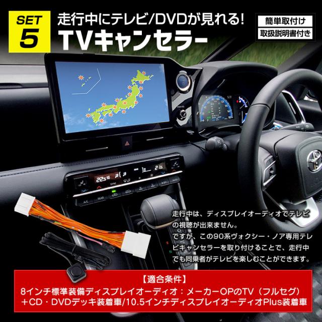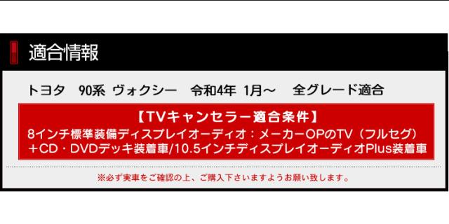トヨタ 90系 ヴォクシー 令和4年1月〜 全グレード適合 【TVキャンセラー適合条件】 8インチ標準装備ディスプレイオーディオ:メーカーOPのTV(フルセグ)+CD・DVDデッキ装着車/10.5インチディスプレイオーディオPlus装着車 に適合 ※テレビの受信、DVDの再生機能がない車両では機能しませんのでご注意ください。 |
