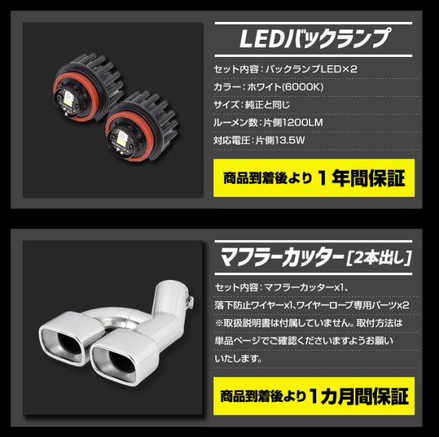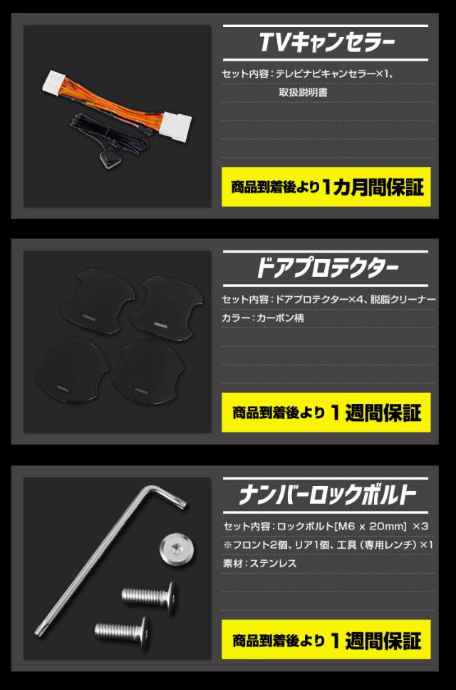 ■3Dスポーツマット [1]本体 1PCS [2]マジックテープ×4 ■抵抗内蔵ウインカーバルブ [1]LEDバルブ ×2個 ■LEDバックランプ [1]交換用LEDバルブ 1セット [2]取扱説明書 ■マフラーカッター [1]マフラーカッター本体 ×1 [2]落下防止ワイヤー ×1 [3]ワイヤーロープ専用パーツ ×2 [4]取扱説明書 ■TVキャンセラー [1]90系ヴォクシー・ノア専用テレビナビキャンセラー [2]取扱説明書 ■ドアプロテクター [1]ドアプロテクター×4 [2]脱脂クリーナー ■ナンバーロックボルト [1]ロックボルト(M6×20mm) ×3 [2]専用工具 ×1 |