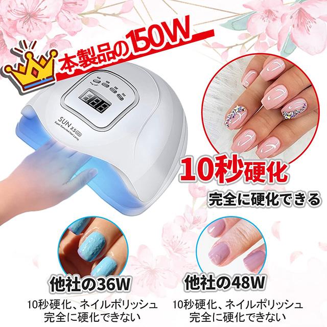 【150W高速硬化】本製品は目にもお肌にも優しい最速ダブル光源技術を採用しています。従来品よりも2倍速くジェルネイルを硬化させます。約365〜405nm広いLED対応周波数でUVジェルなどほぼ全てのジェルを硬化可能です!家庭やサロンでの使用に最適です。