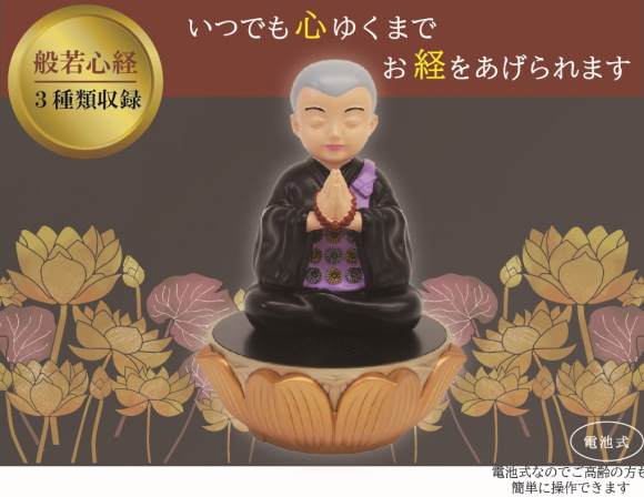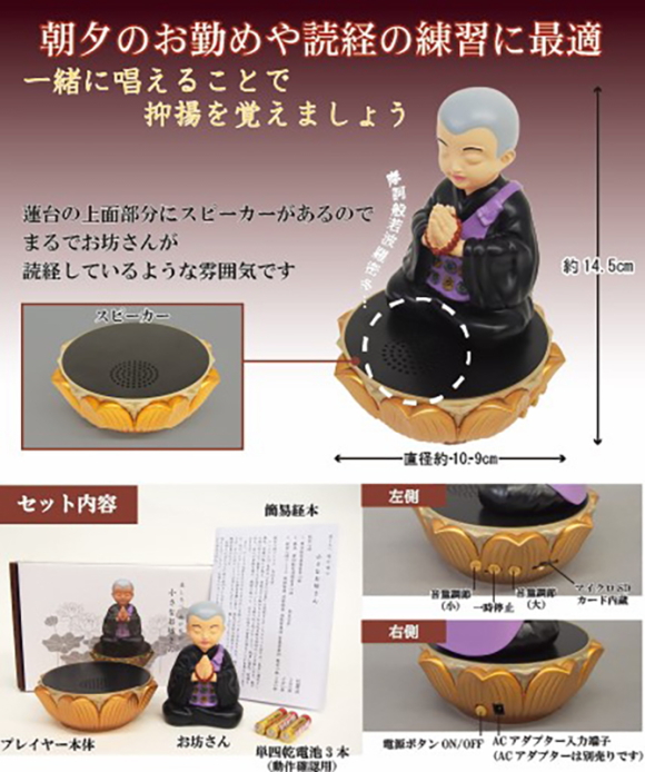 朝夕のお勤めや、読経の練習に最適!いつもあなたの傍らで厳かにお経を唱えてくださる小さなお坊さん。スイッチ1つで座禅を組んだ小さなお坊さんが般若心経を読経してくれ、まさに我が家専属のお坊さんです。実際の僧侶の読経をデジタル録音で収録しており、可愛い見た目でも読むお経は本格的です。優しいご尊顔から流れる厳かな読経に心が浄化されます。電源スイッチとボリュームダイヤルだけの簡単操作!電池式でご高齢の方にも簡単に操作していただけます。般若心経、佛説般若心経、般若心経マントラの3種類を収録されたマイクロSDが内臓されており、届いたその日からご利用頂けます。
