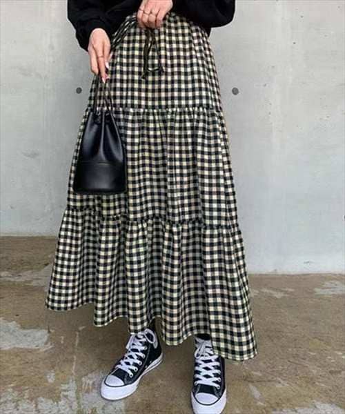 レディース ギンガムチェックロングティアードスカート