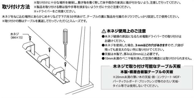 | 備考 | 取り付け可能なテーブル:約幅27.5cm×奥行6cm以内に干渉する柱や脚がなく、厚さ約2cm以上の木製・積層合板の天板裏のテーブル |