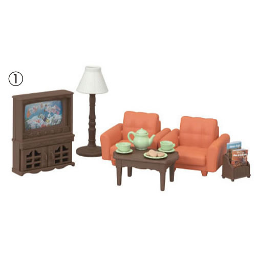 内容/(1)シングルソファ×2、テーブル、テレビ、スタンドライト、マガジンラック、ポット、ふた、カップ×2、ソーサー×2、皿、リーフパイ×3、画面シートA、画面シートB、雑誌A、雑誌B(2)ベッド、マットレス、勉強机、いす(勉強机用)、ピアノ、いす(ピアノ用)、スタンドミラー、ランプ、写真立て、目覚まし時計、本×2、ペン立て、鉛筆、ペン、デスクマット、かけぶとん(3)キッチン、引出し、テーブル、いす×2、冷蔵庫、冷凍室、野菜室、皿×2、フォーク×2、コップ×2、クロワッサン×2、目玉焼き×2、たまご、りんご×2、オレンジジュース、バスケット、フライパン、フライ返し、オーブントレイ(4)二段ベッド、テーブル、いす(うさぎ)、いす(くま)、チェスト、すべり台、引出し(ちょうちょ)、引出し(さくらんぼ)、引出し(りんご)、お絵描きボード、ランチプレート×2、フォーク×2、マグカップ×2、お家、くるま、かけぶとん(ピンク)、かけぶとん(グリーン)、プレイマット(5)シャワー、バスタブ、洗面台、トイレ、バスラック、ペーパーラック、トイレブラシ、バスケット、歯ブラシ、コップ、シャンプー、ボディソープ、スポンジ、タオル