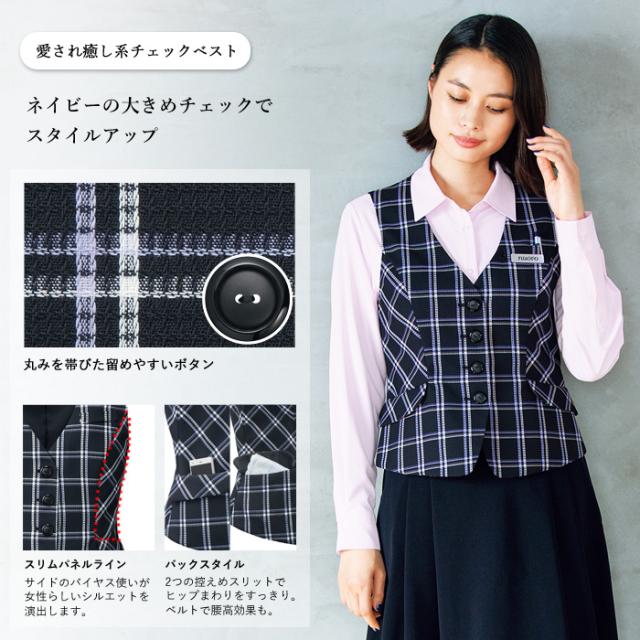 事務服 ベスト レディース スーツ 制服 nuovo 秋冬 春 FOLK チェック柄 ネイビー 紺【送料無料】おしゃれ 女性 医療事務 受付 接客 冠婚葬祭 仕事 セレモニー オフィス フォーマル ポケット付き かわいい おうちで洗える