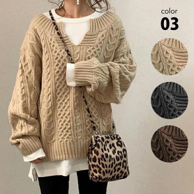 レディース キーネック セーター 秋 冬 ベージュ ブラック ブラウン フリー ニット キーネック Vネック ローゲージ ケーブルニット ビッグシルエット オーバーサイズ