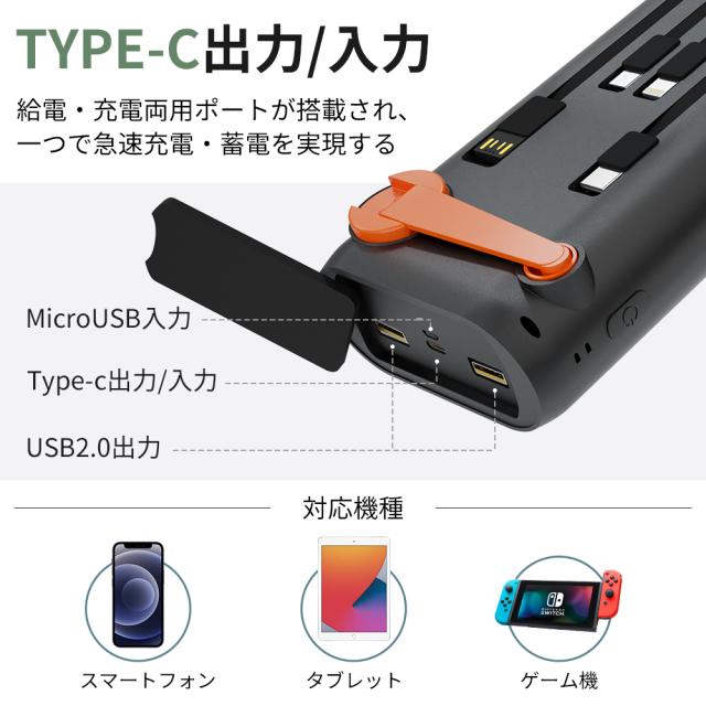 ■【ケーブル内蔵&5台同時充電可能】 Type-Cなど向けの3規格出力ケーブルが内蔵されており、専用ケーブルを持ち歩く必要がなく、最大3Aの急速充電をサポートし、どんなタイプのスマホにも素早く充電することができます。