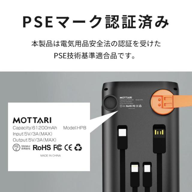 【61200mAh超大容量&最大3A急速充電】 圧倒的な61200mAh大容量により、USB充電を使った各機種に複数回も充電可能。また、入出力兼用Type-Cポートを搭載し、スマホやタブレットはもちろん、モバイルWi-Fiルーター、携帯ゲーム機やノートPCまで幅広く高速充電できるため、日頃の使用だけでなく、台風、地震など災害時の非常用電源としても、電熱ベスト用バッテリーとしても適しており、電池切れの心配はありません。最大出力DC 5V /3Aは通常よりも速く充電でき、充電時間を短縮できます。